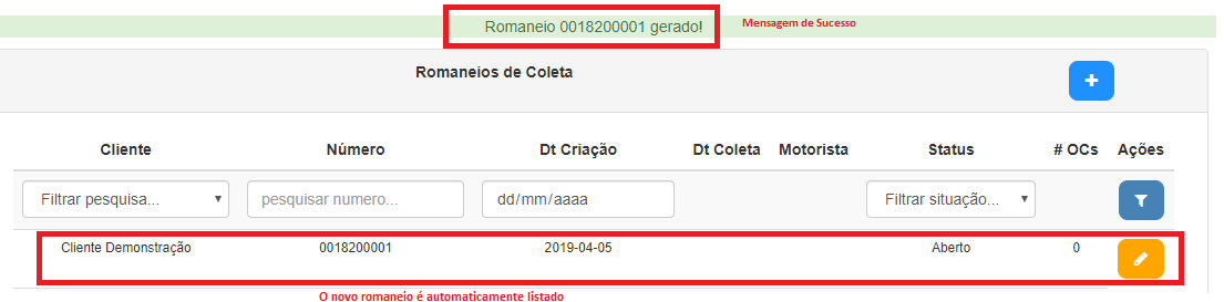 Deverá ser apresentada uma mensagem de sucesso e o novo romaneio será listado