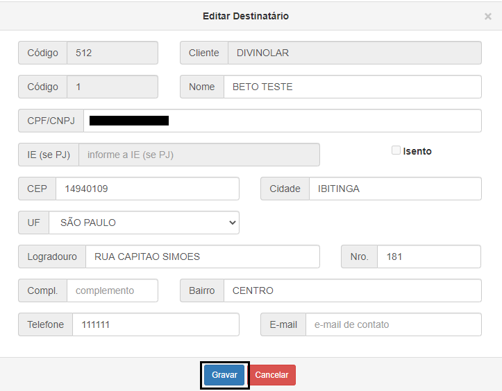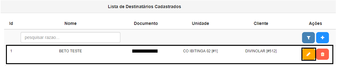 O sistema irá retornar para a listagem de destinatários, e se o cadastro estiver ok, uma mensagem de sucesso mostrada.