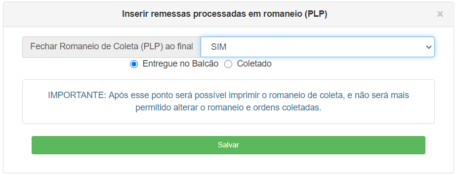 Alterar a opção Fechar Romaneio de Coleta ao final para SIM e [Salvar].