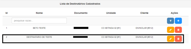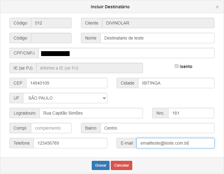 IMPORTANTE: Não é possível cadastrar dois destinatário com o mesmo documento